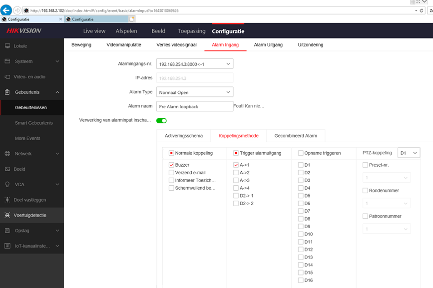 Aller aux événements puis « entrée d'alarme » dans les paramètres du NVR. Ici, vous pouvez rechercher l'entrée concernée de la caméra concernée, après quoi une sortie du NVR peut y être liée. Répétez l'opération pour l'entrée 2 de la caméra également.